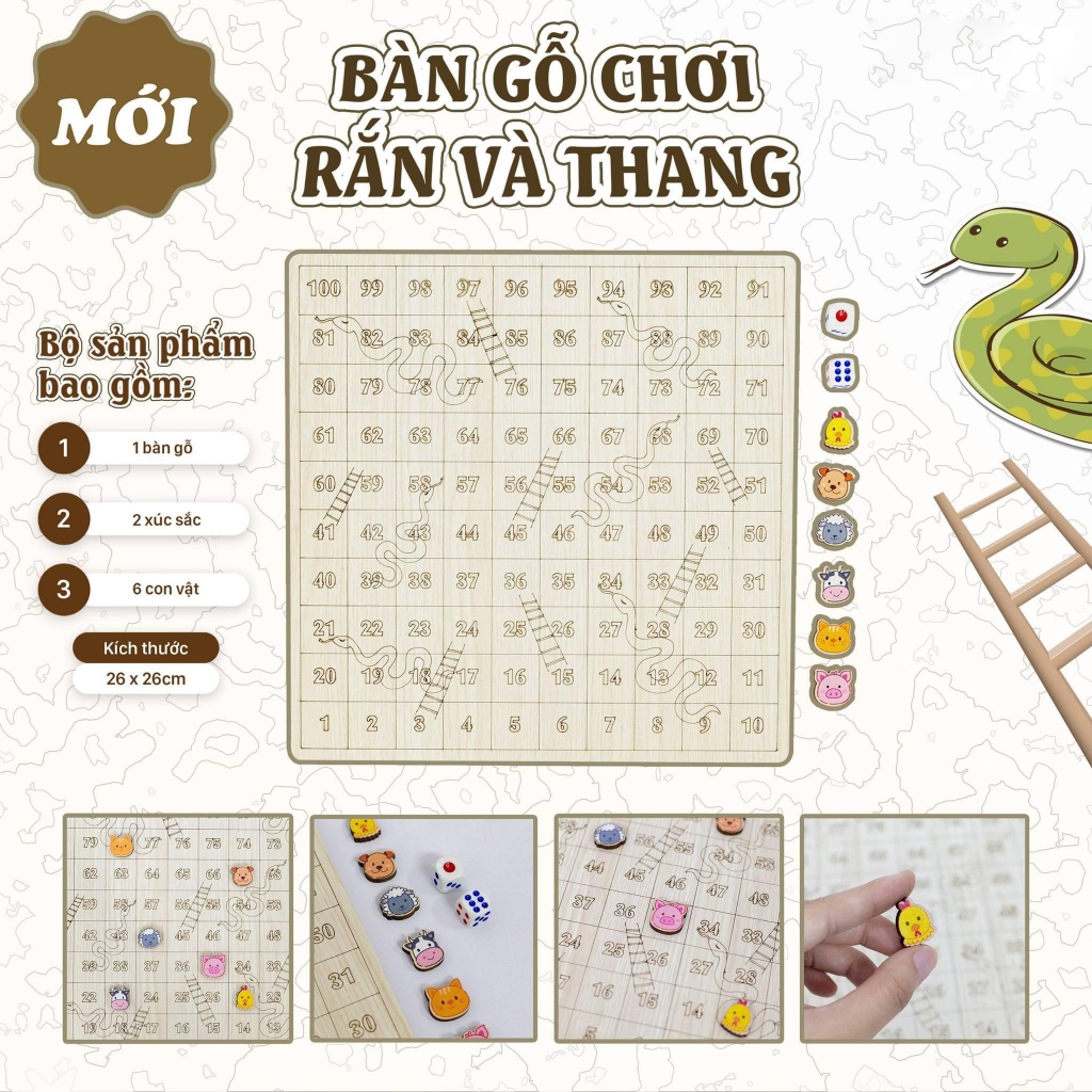 BỘ TRÒ CHƠI RẮN LEO THANG BẰNG GỖ VUI NHỘN (GỖ MDF DÀY, PHỦ MELAMINE 2 MẶT, CÓ HƯỚNG DẪN CÁCH CHƠI) - SẢN PHẨM MONTESSORI CAO CẤP